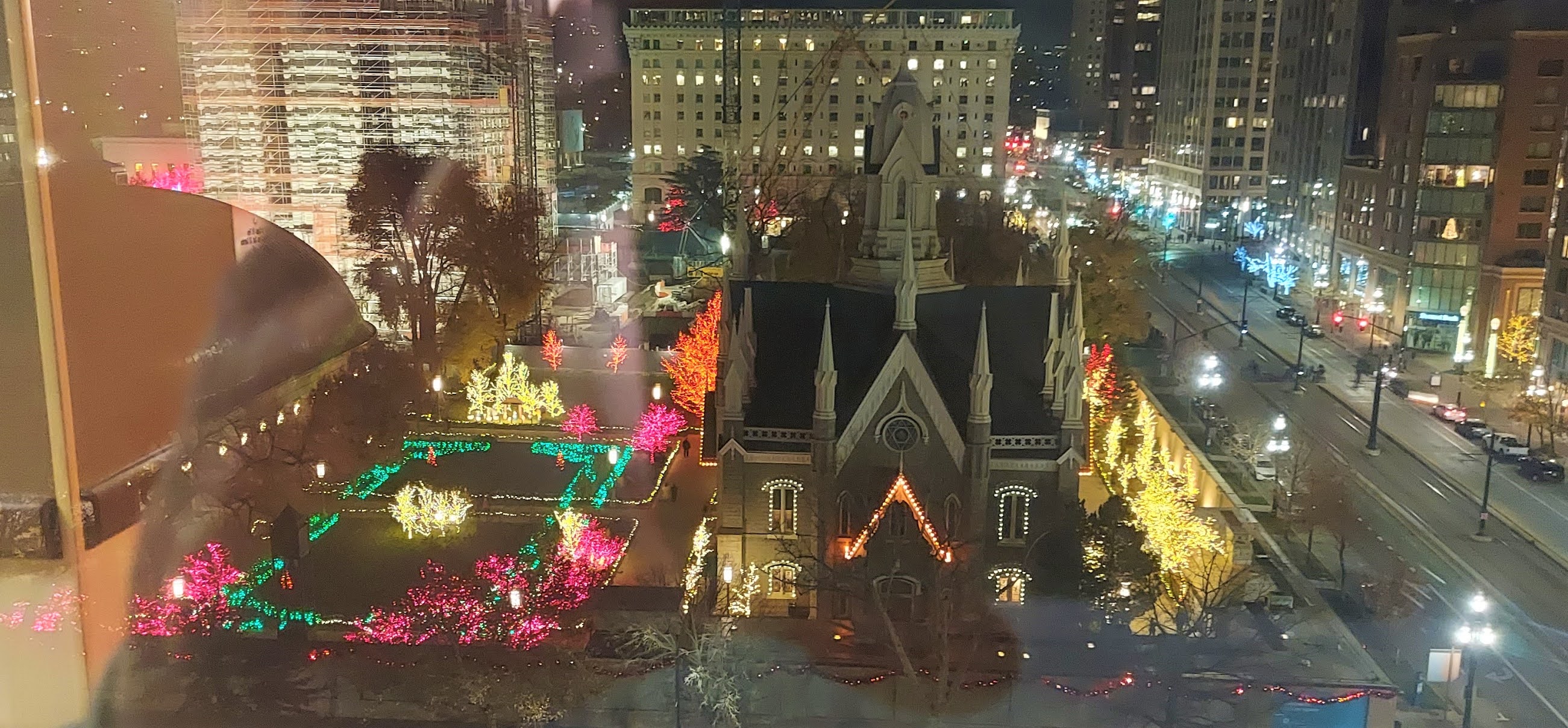 There were plenty of lights in other places around the city, though, so the Christmas spirit is still alive and well in Mormonville and we have had no trouble finding fun things to do. The Mormon Tabernacle and the “Assembly Hall” are across the street from our hotel. This magnificent building was constructed with the scraps that were left over when the Temple itself was completed in 1893. The grounds of these two buildings are decorated and lighted and open to the public.